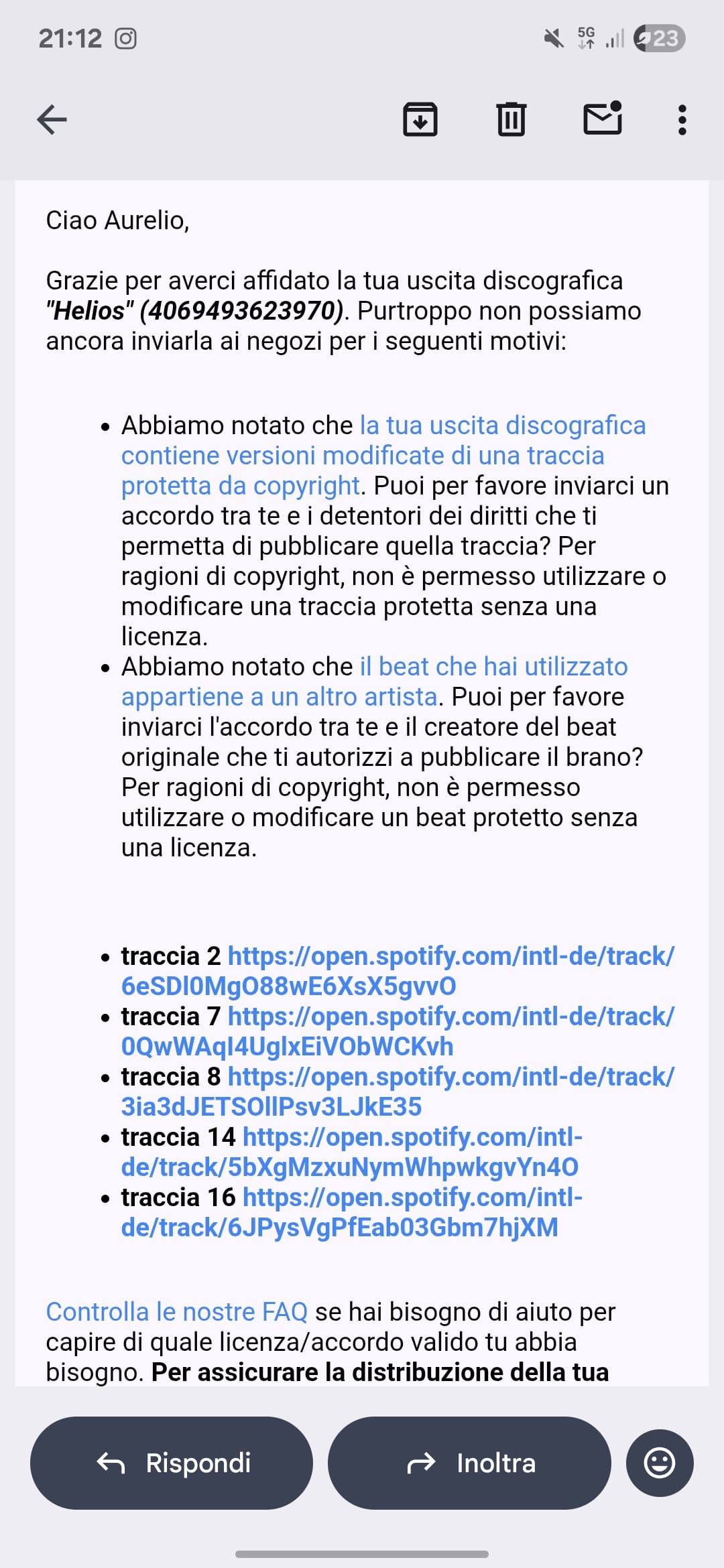 salve, ho da poco pagato per la pubblicazione del mio album “Helios” e mi arriva una email dove mi dicono di non poter continuare la pubblicazione poiche ci sono delle traccie protette da copyright chiedendomi la licenza, io ho mandato la licenza, ma mi chiedono pure la licenza di altre traccie che però sono delle cover, e ho messo per ogni cover presente autori ed editori originali specificanto che fossero cover prima di mandare l’album, mi chiedono pure la licenza di una traccia che avevo indicata come mia per sbaglio ma è anch’essa una cover. qualcuno mi puo aiutare?
