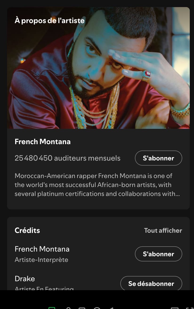 Je souhaite savoir comment obtenir un profil d’artiste complet sur Spotify, avec la section « À propos de l’artiste », les crédits, les statistiques d’auditeurs mensuels et les boutons « S’abonner » comme sur la page de l’artiste French Montana.