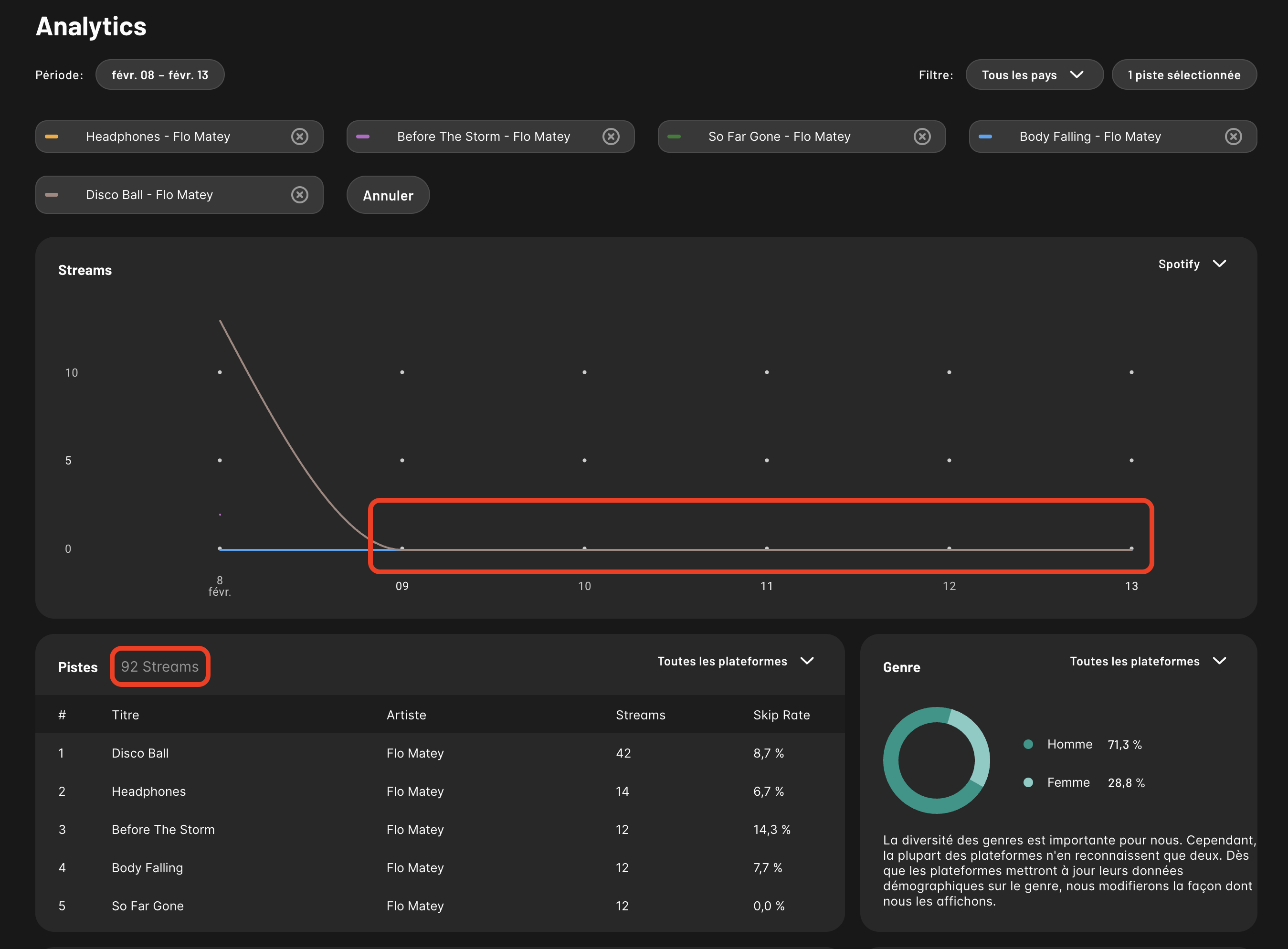 It’s just in your screenshot, the graph is “Spotify only” for every tracks, and in the data details, the 92 streams are counted for “all platforms” ?