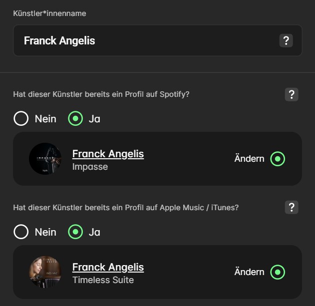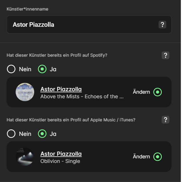 Thanks for your reply. I have followed the steps and hope that the changes can still be made, as it is still in quality review with you. The composer Astor Piazzolla and Franck Angelis are both composers and artists and they have profiles on Spotify and Apple (see attached screenshots).